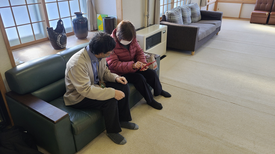 今回は参加者が3名と少人数だったため、講習形式ではなく個別に対応する形で実施。スマートフォンでの「オトモノアプリのインストール」や「LINEの友達登録や写真の送信」「画像検索」など、一人ひとりの具体的な要望に合わせて丁寧にサポートを行いました。 学習会の最後には、寿大学用のLINEオープンチャットに参加していただき、研修旅行の動画などを鑑賞し、和やかに終了しました。