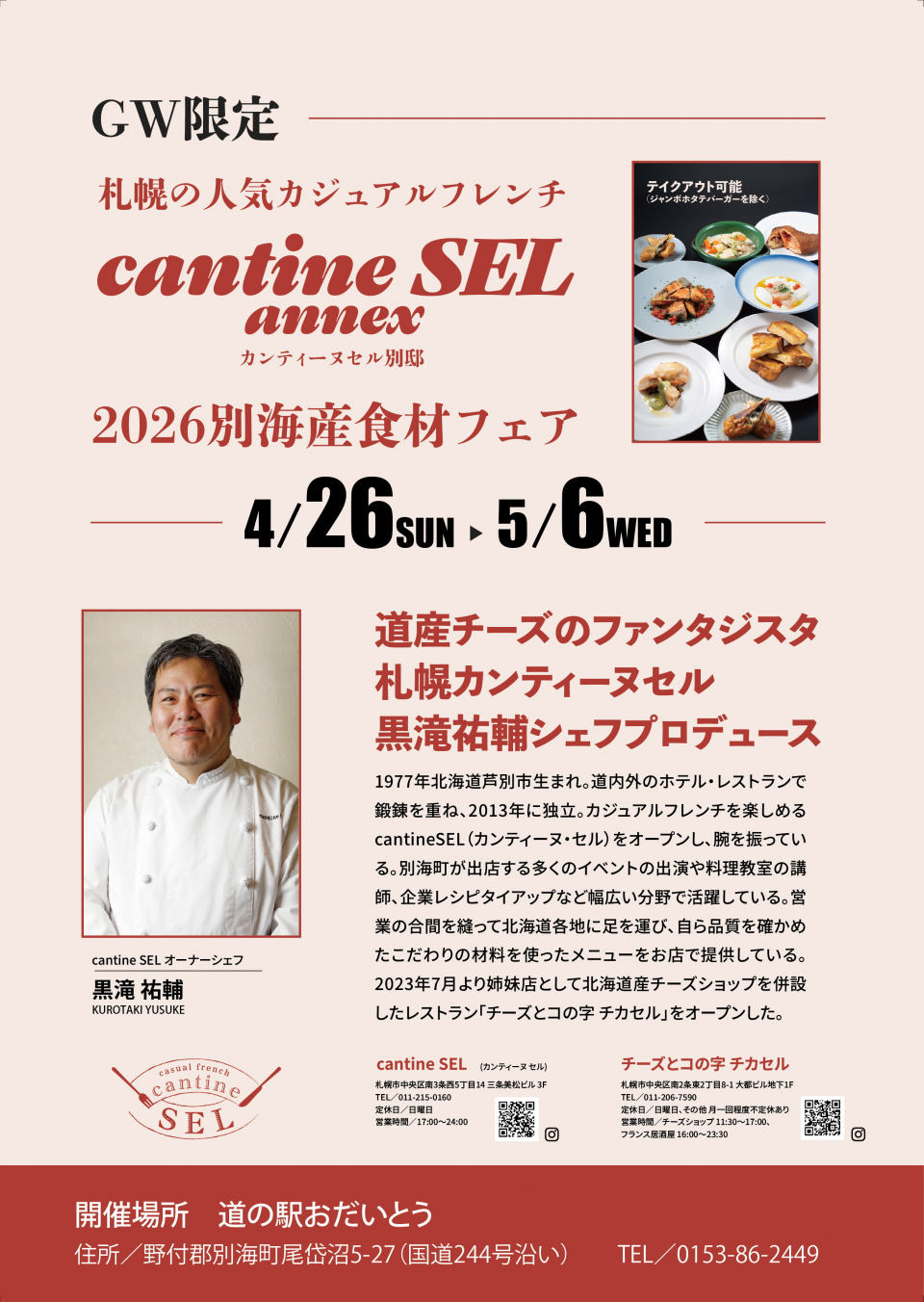 道の駅おだいとうでは、5月6日までのゴールデンウィーク期間中、2026別海産食材フェアと銘打って、札幌の人気カジュアルフレンチの黒滝祐輔氏がプロデュースしたメニューを多数ご用意。