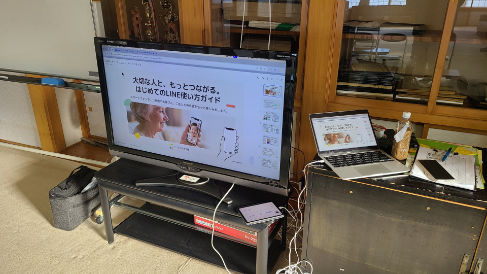 今回は参加者が3名と少人数だったため、講習形式ではなく個別に対応する形で実施。スマートフォンでの「オトモノアプリのインストール」や「LINEの友達登録や写真の送信」「画像検索」など、一人ひとりの具体的な要望に合わせて丁寧にサポートを行いました。 学習会の最後には、寿大学用のLINEオープンチャットに参加していただき、研修旅行の動画などを鑑賞し、和やかに終了しました。