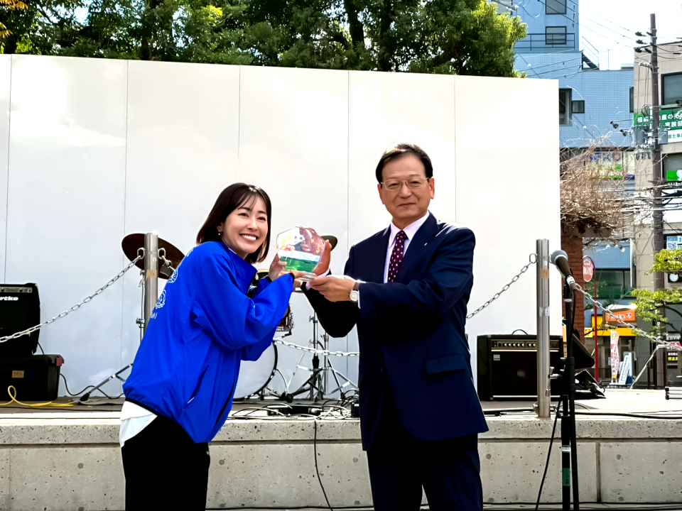 11月22日(土)に大阪府枚方市で開催された「枚方市友好交流都市物産展」において委嘱状の交付式を行い、町長から前田さんへ委嘱状が交付されました。