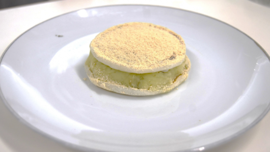 別海町の良さを知ってもらうために、和菓子といえば…のどら焼きを作りました。生地を作る際に、本来は水を使うところを牛乳にすることで味をまろやかにし、カルシウムやビタミンBを摂取できます。また、あんこにカッテージチーズを混ぜることで、あんこに足りない栄養を牛乳で補っています。